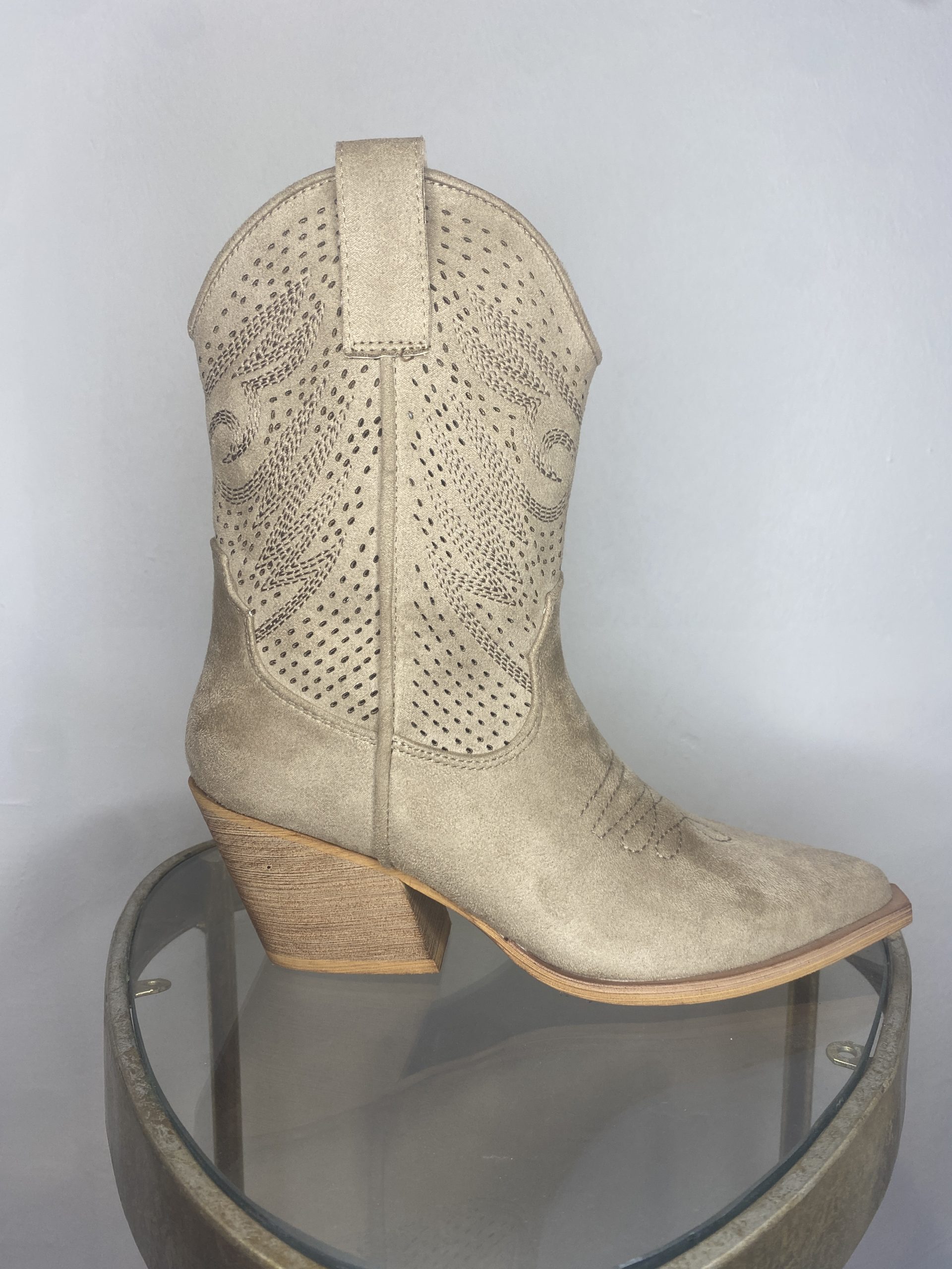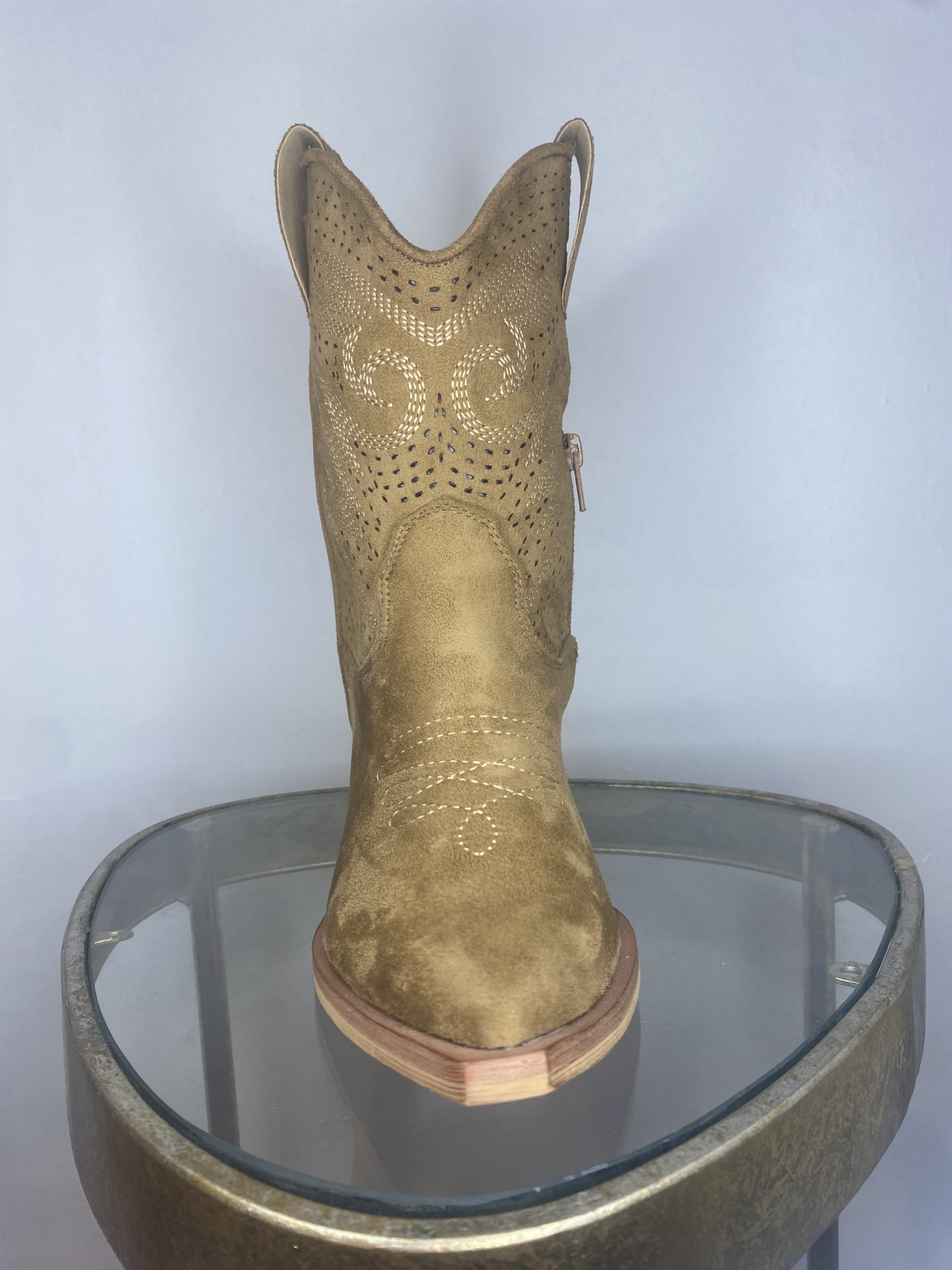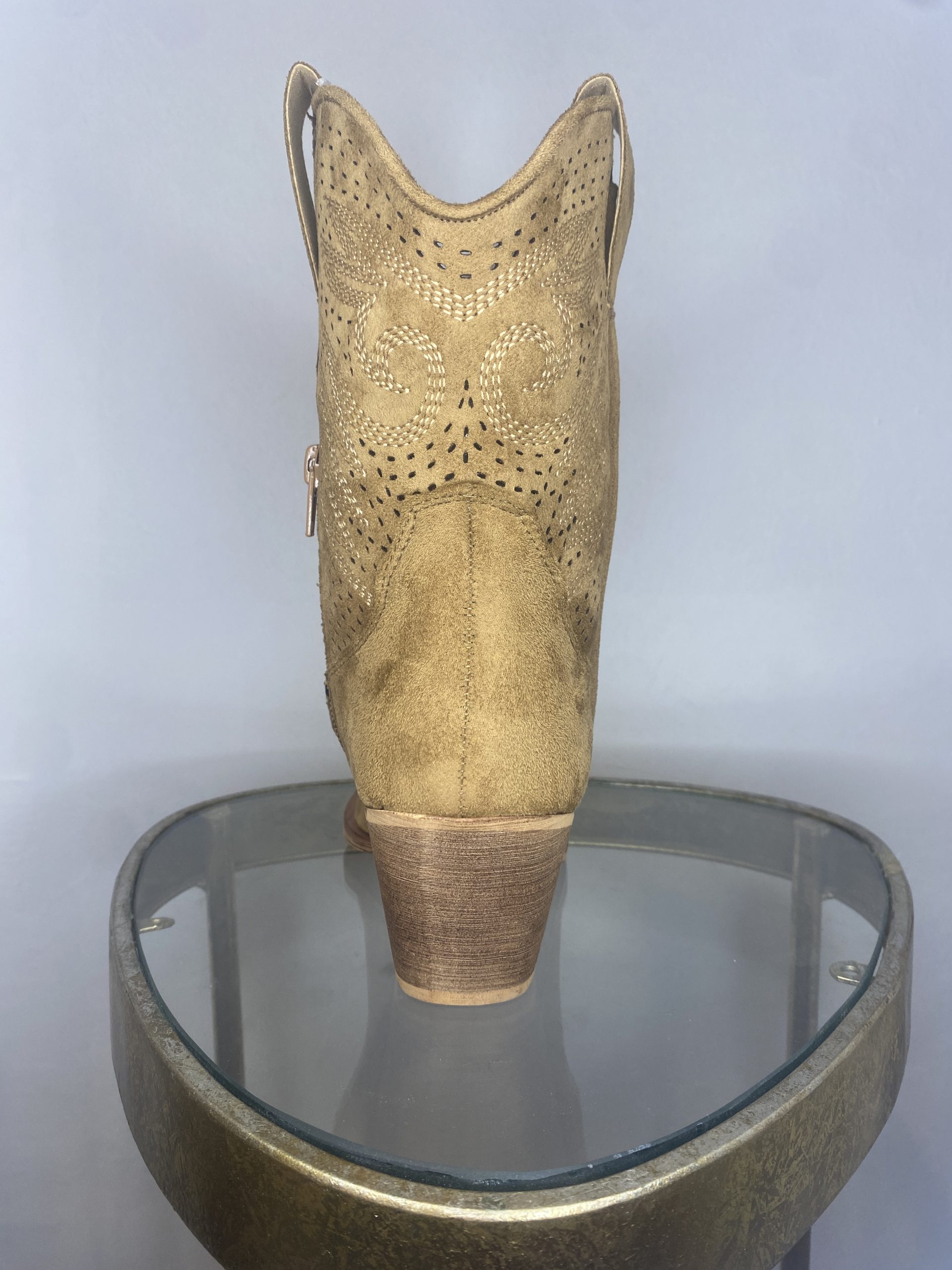 Composición: Antelina con bordados y troquelado en laser | Color: camel, arena | Tallas: 36 a 41