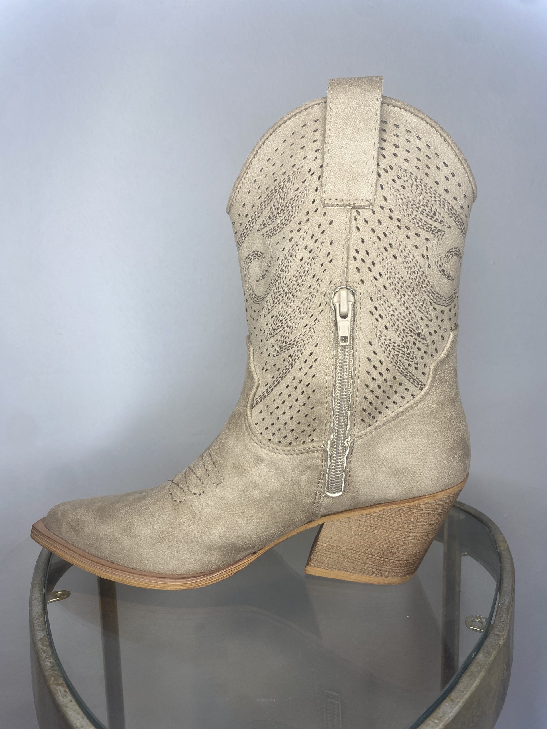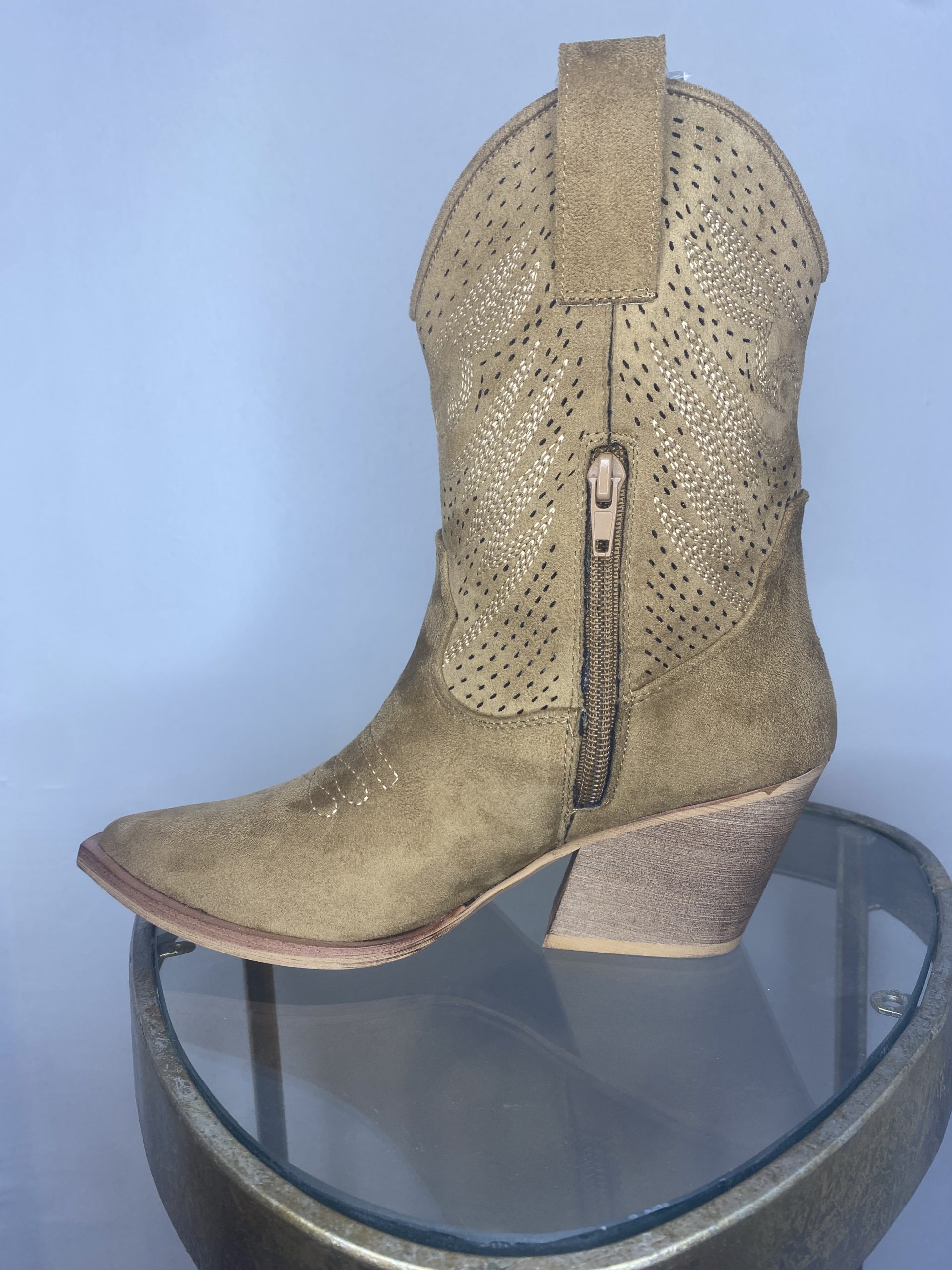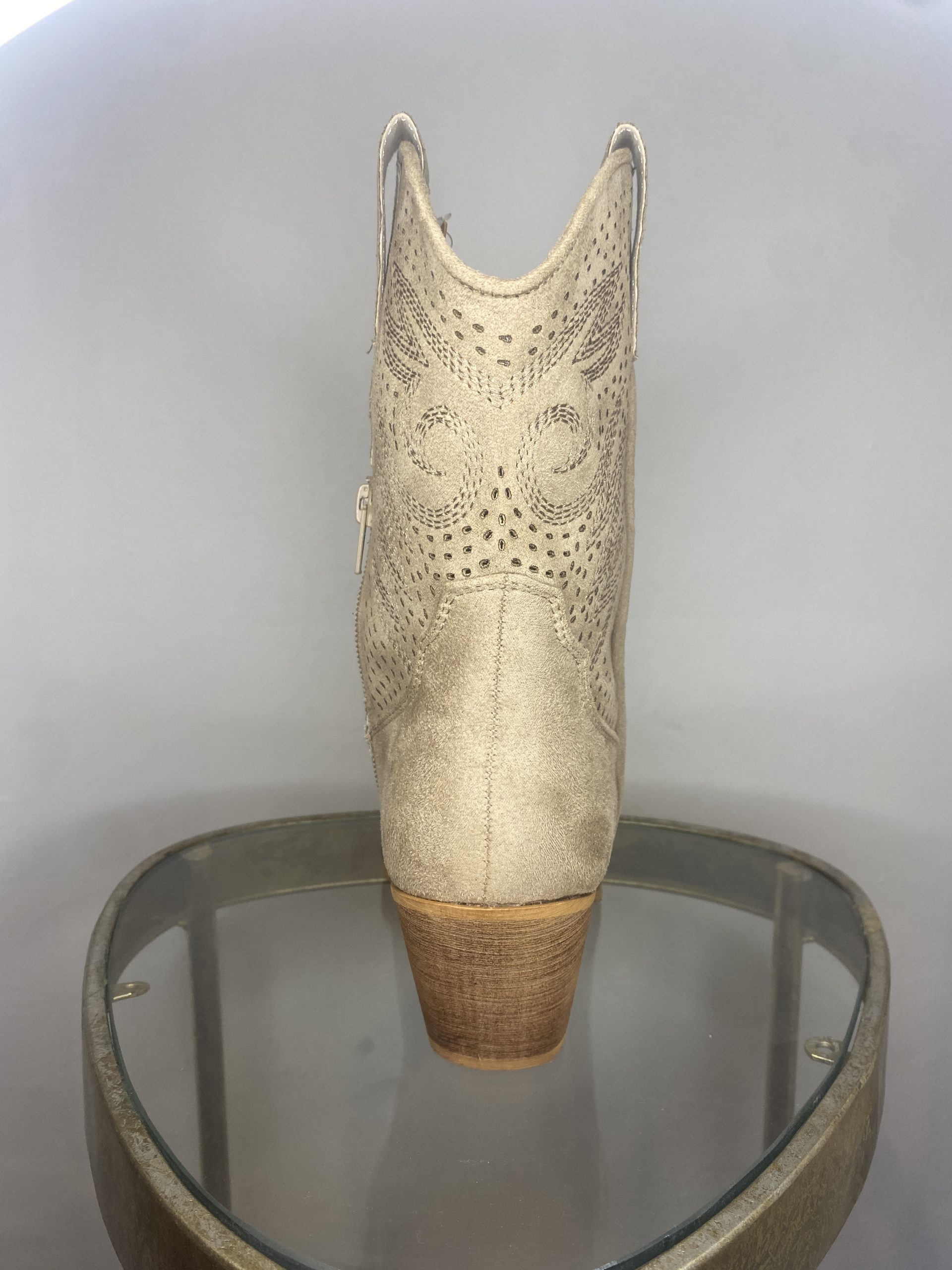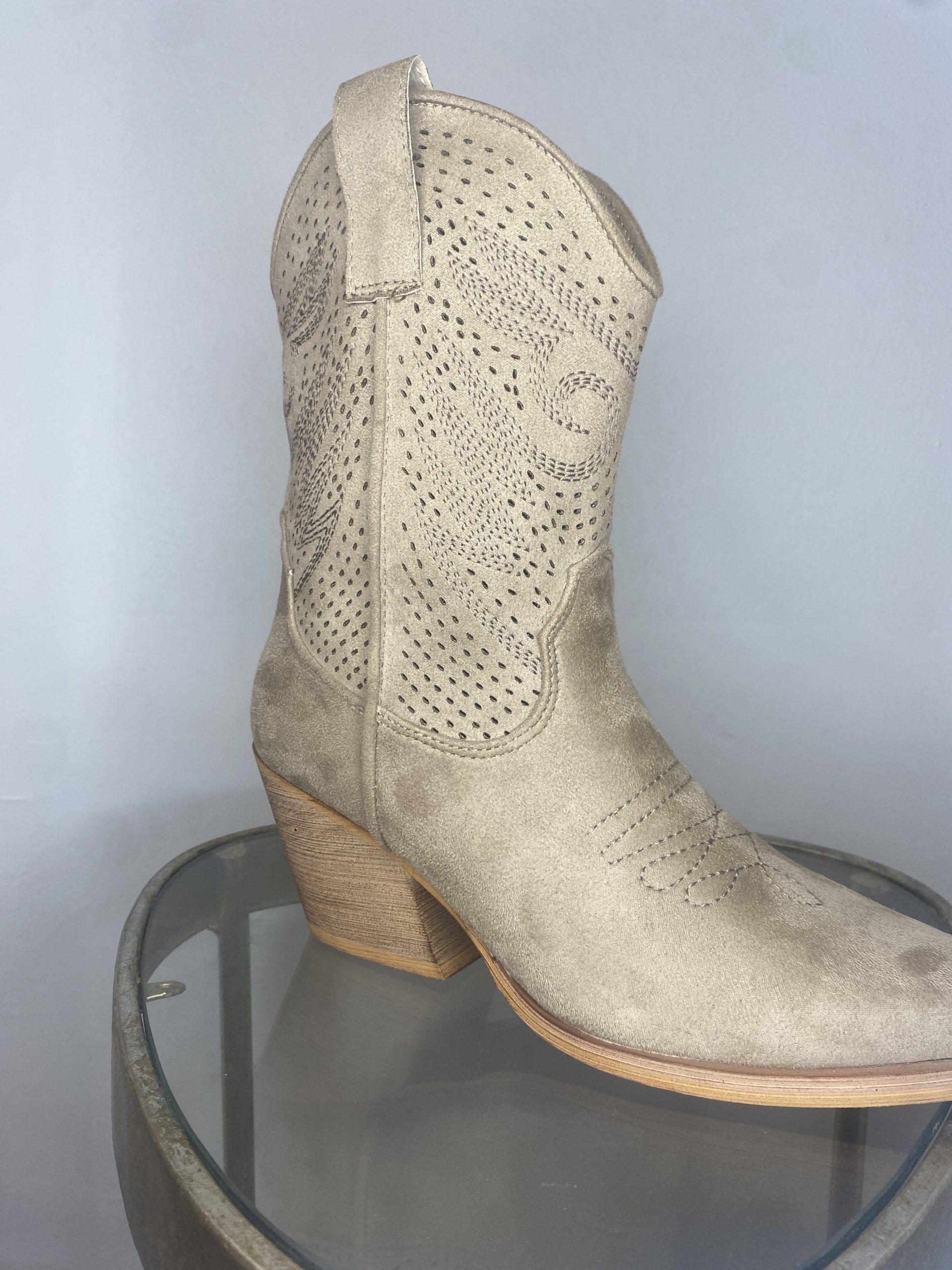 Composición: Antelina con bordados y troquelado en laser | Color: camel, arena | Tallas: 36 a 41