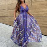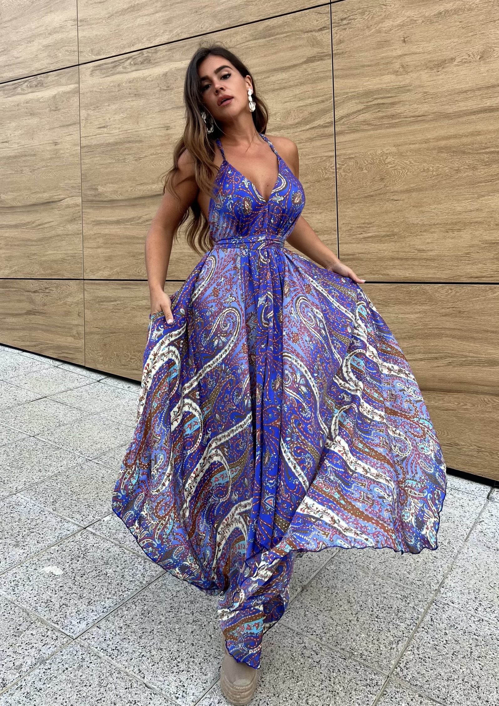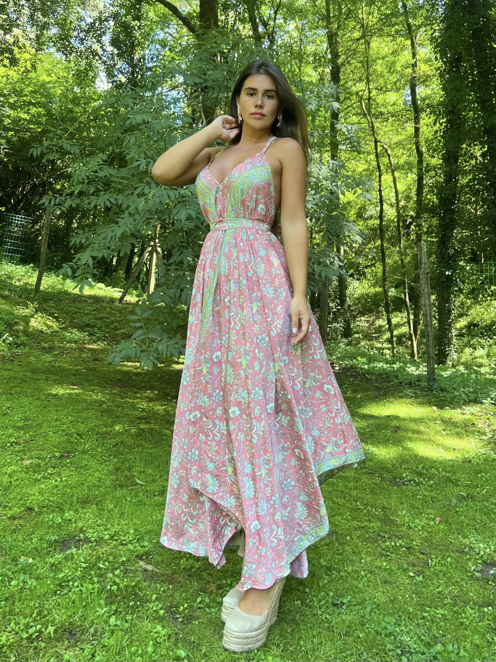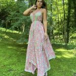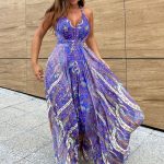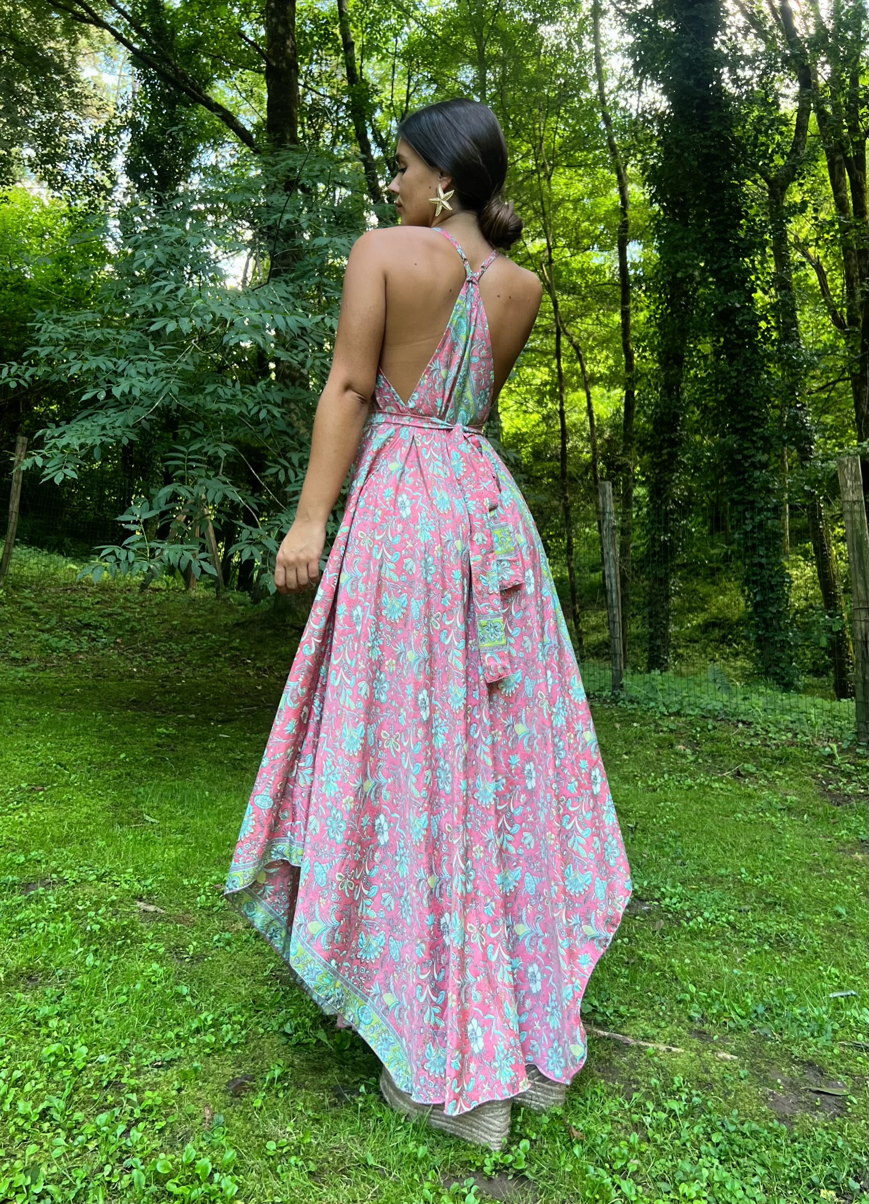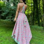 Vestido largo Santorini, el vestido con una caída asimétrica en la derecha de izquierda.